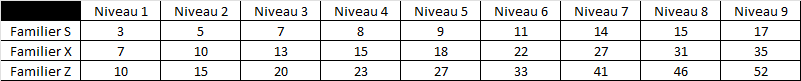 Modifications des statistiques des niveaux de familier (INT/DEX/FOR/END) :
